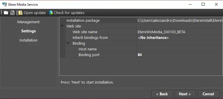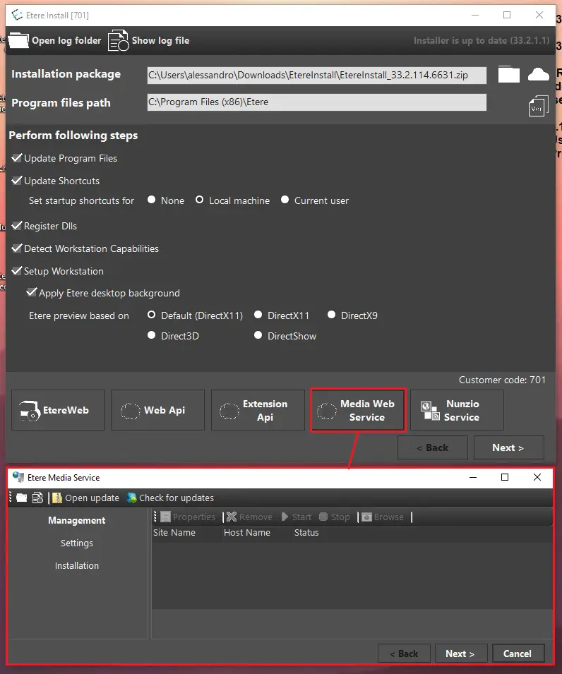 Installation package: Path and filename of the Media Web Service package just downloaded. By default, it's downloaded in the current user's local Downloads folder, in a subfolder (created by the installer) called EtereInstall.