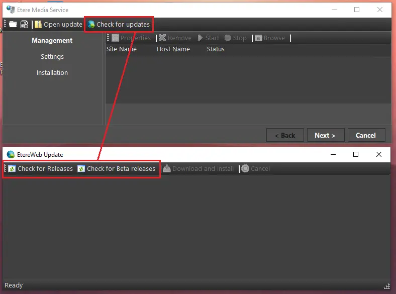 2. Click on Check for updates, then choose to look for releases or beta releases, clicking on the appropriate button: