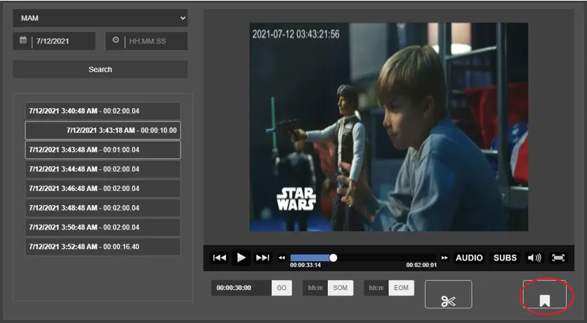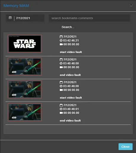 The Bookmarks function allows you to search for recorded files in Memory using the comments added to the files.
