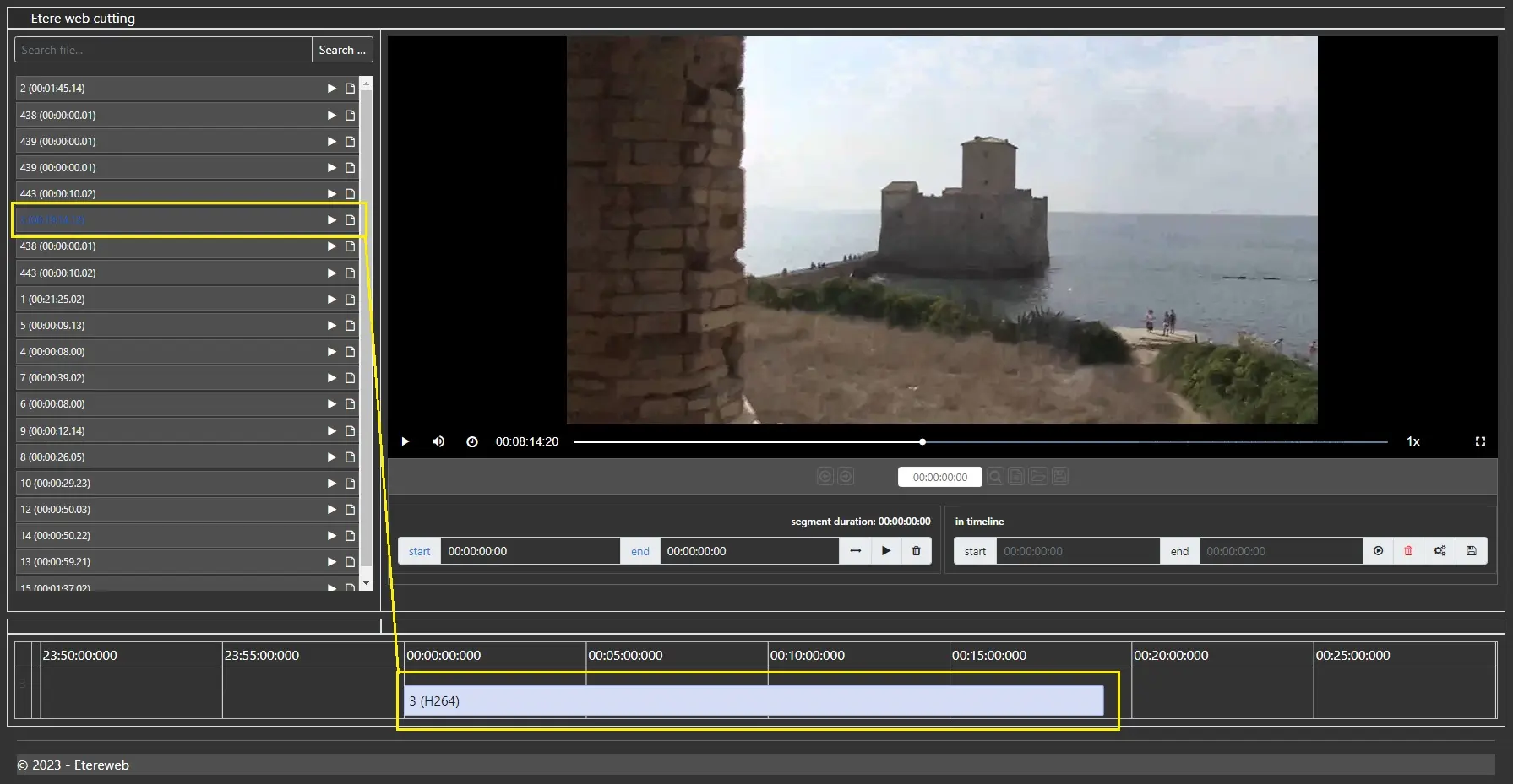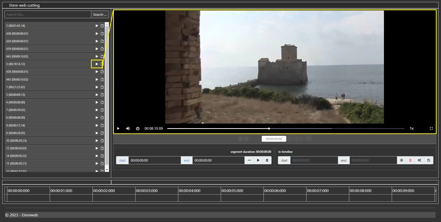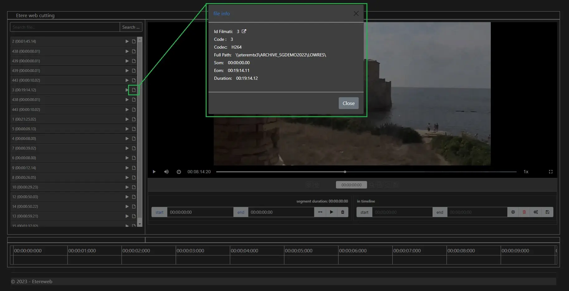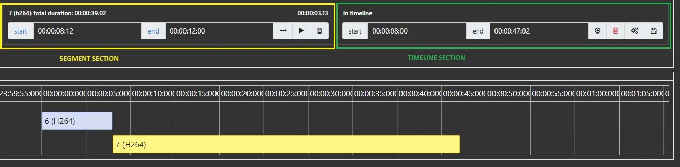 It is possible to start the play of the object by using the "play" button on the segment section of the toolbar, and while media is playing, it is possible to use the "start" and "end" buttons to set SOM and EOM of the segment that is intended to be used. Every time marks are modified, the "SAVE" button on the timeline section must be used to update the interface correctly. The "trashbin" button will remove the object from the timeline.