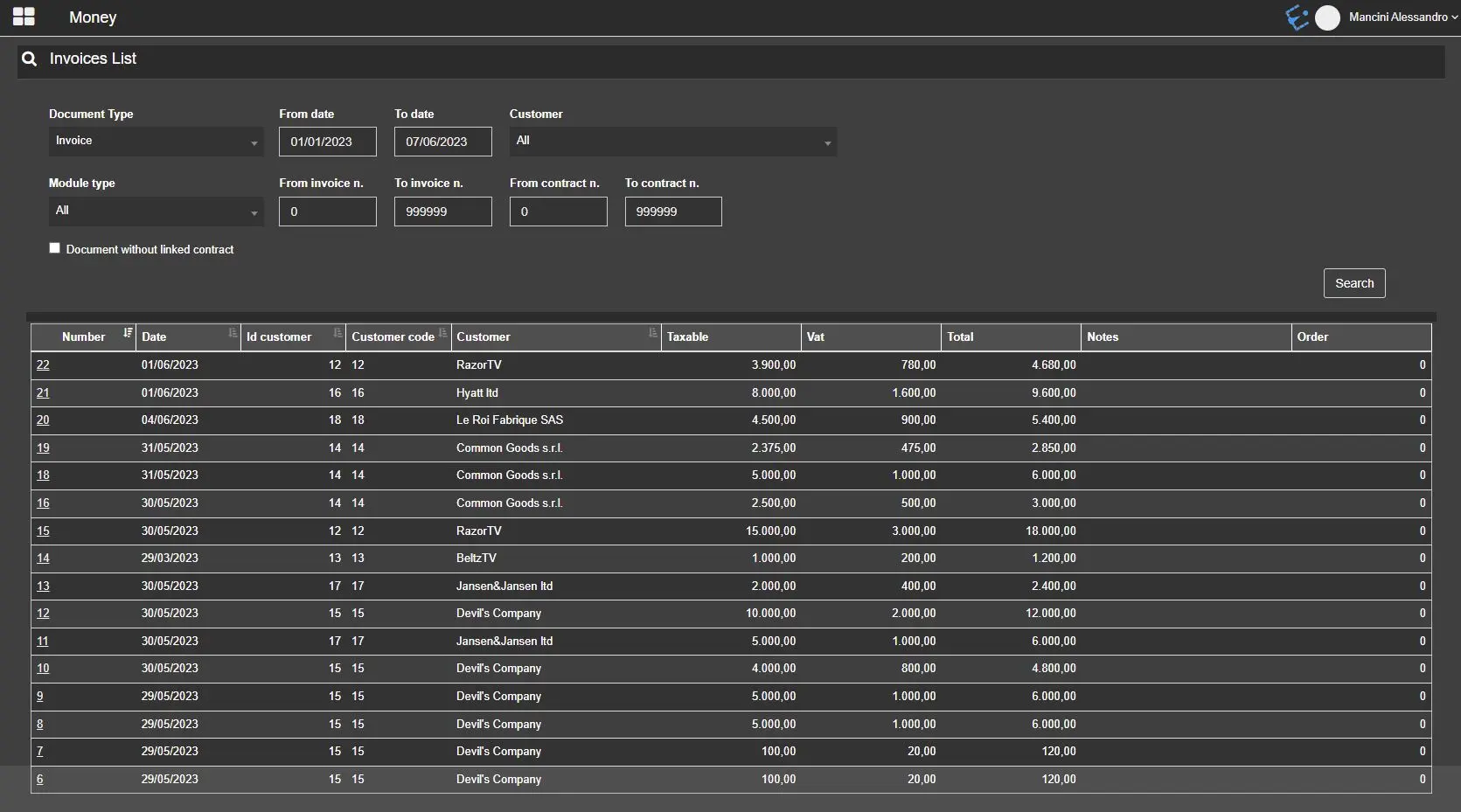 Customer: Search invoices issued to a specific customer or all of them.