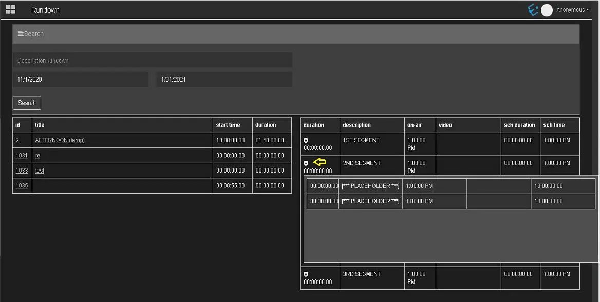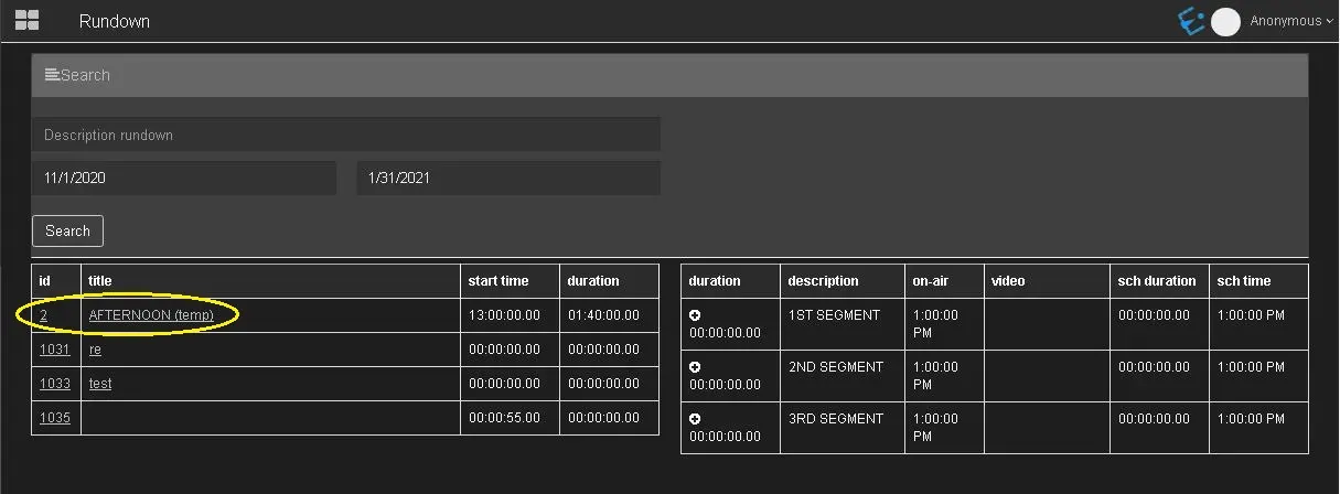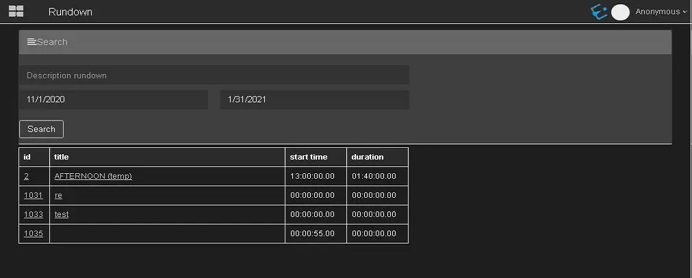 In the Rundown node, you can search for rundowns that match the search criteria.
