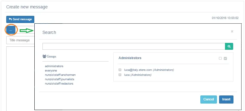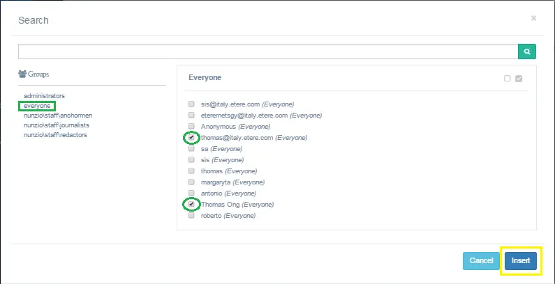 When all desired users are selected, click the <Insert> button to confirm your selection. The selected recipients would be inserted into the text box, as shown in the image below.