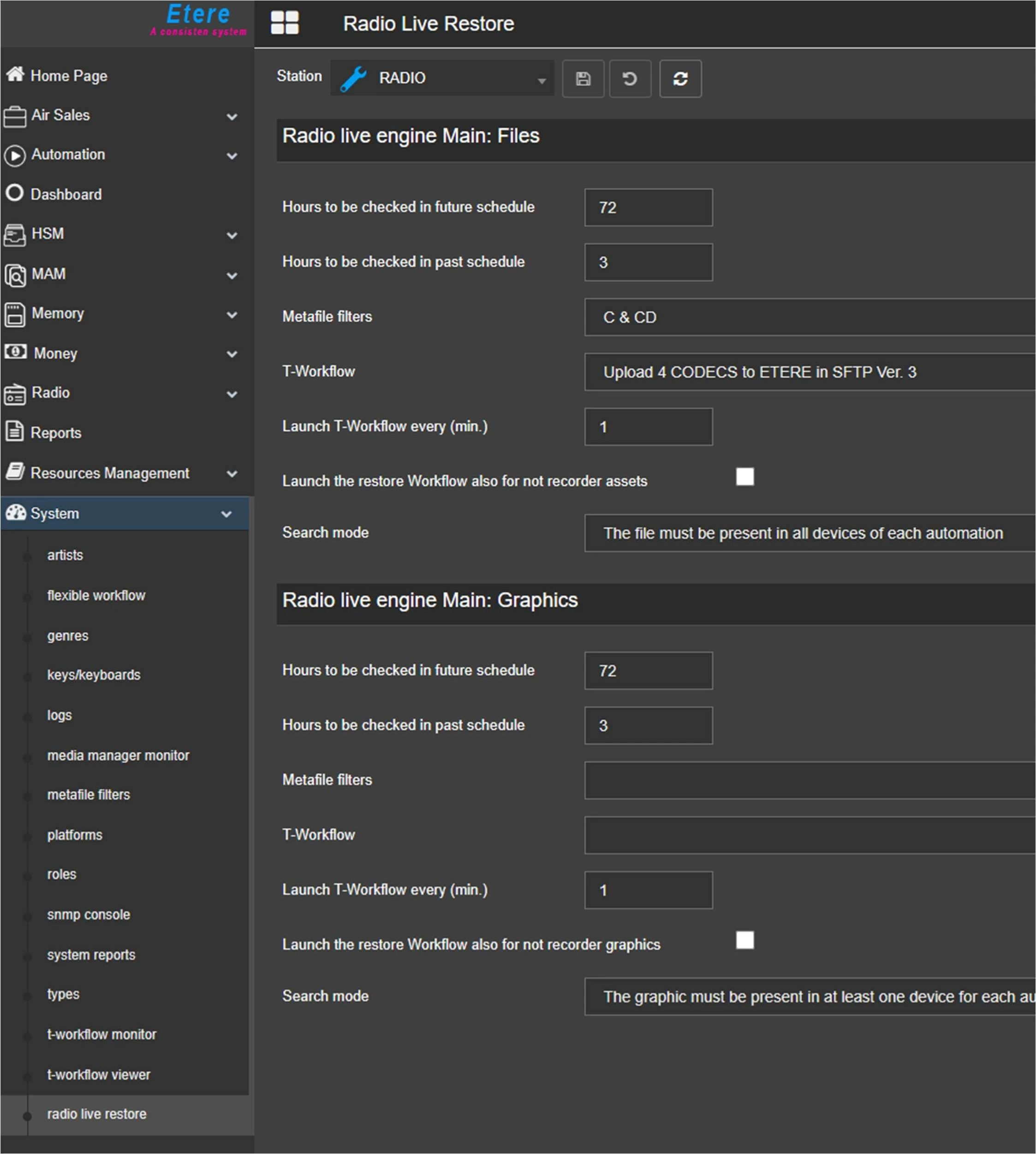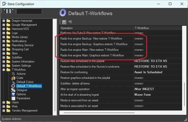 The restore workflows set in these sections can be configured also in Etere Configuration > Configuration editor > T-Workflow > Default T-Workflows: