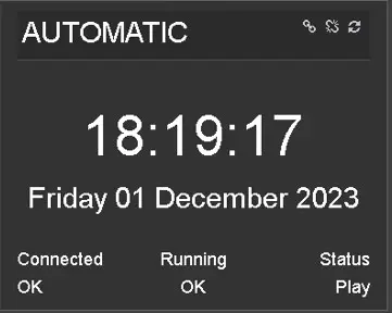 The Status panel shows information about the connection between Radio-Live and the remote panel, the playlist status AUTOMATIC or LIVE ASSIST, depending on the user's choice, and the current time and date.