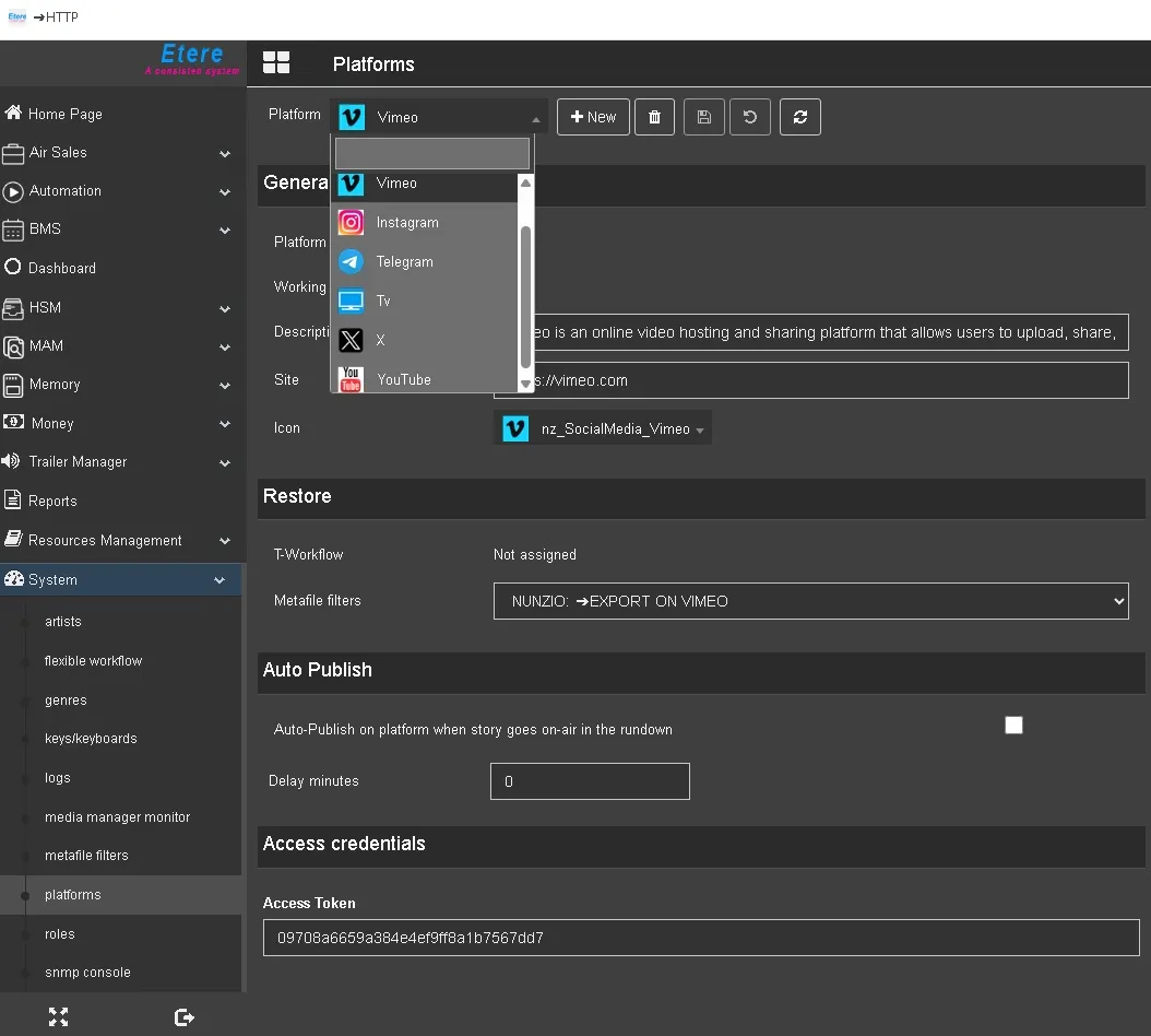 The Platform section allows you to configure the various types of social networks with which you can connect with ETERE Nunzio and Service Social Media.
