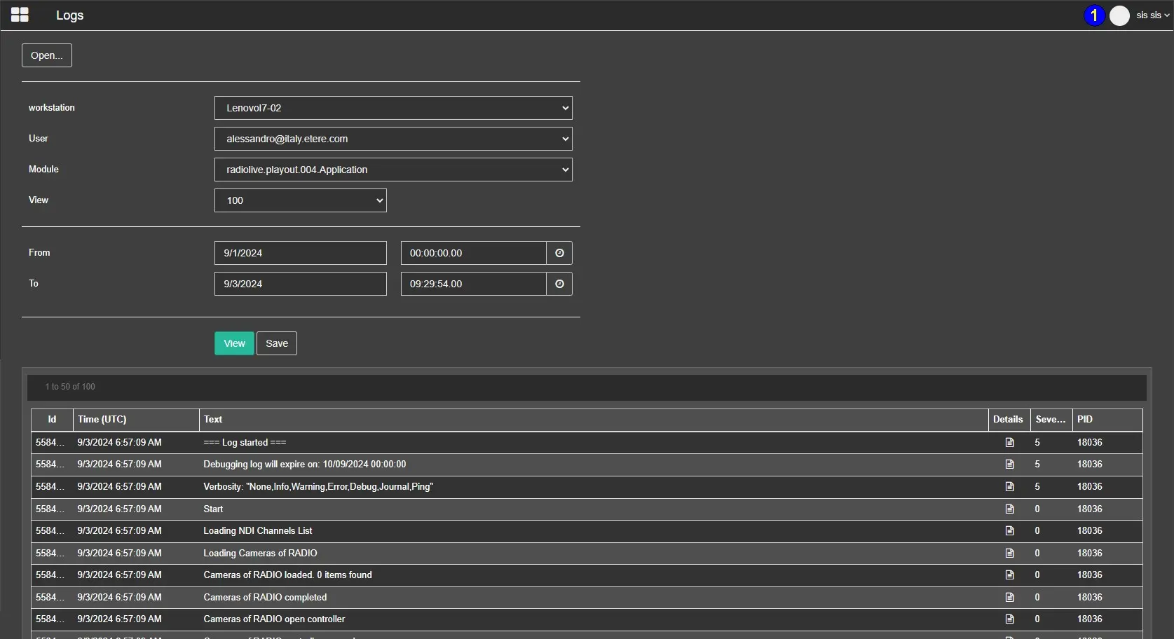 This section allows to view the logs of 64-bits etere modules stored in the logs database.