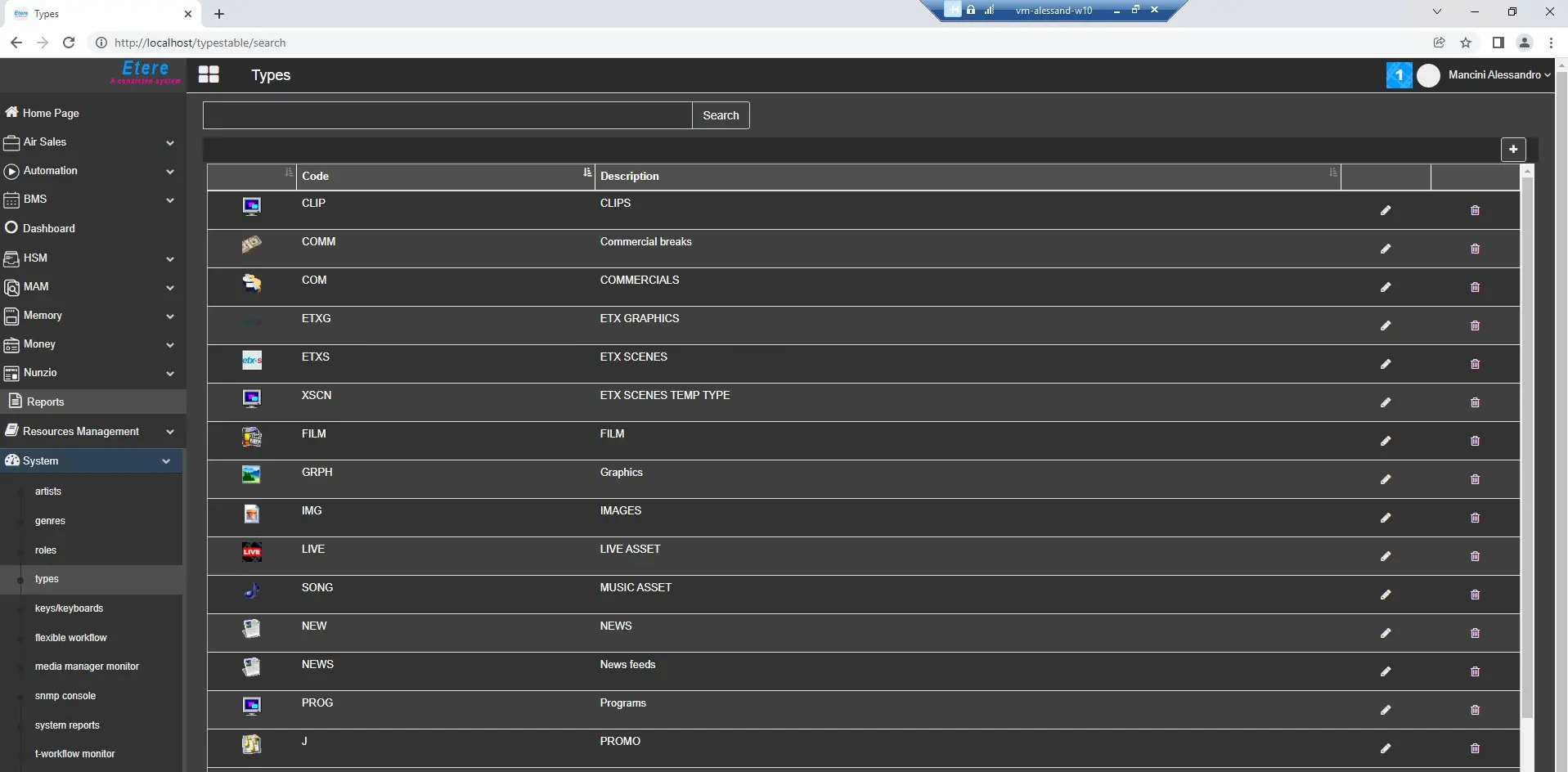 The Types section in Etereweb allows to add new asset types and modify some of the properties or delete the already existing ones.