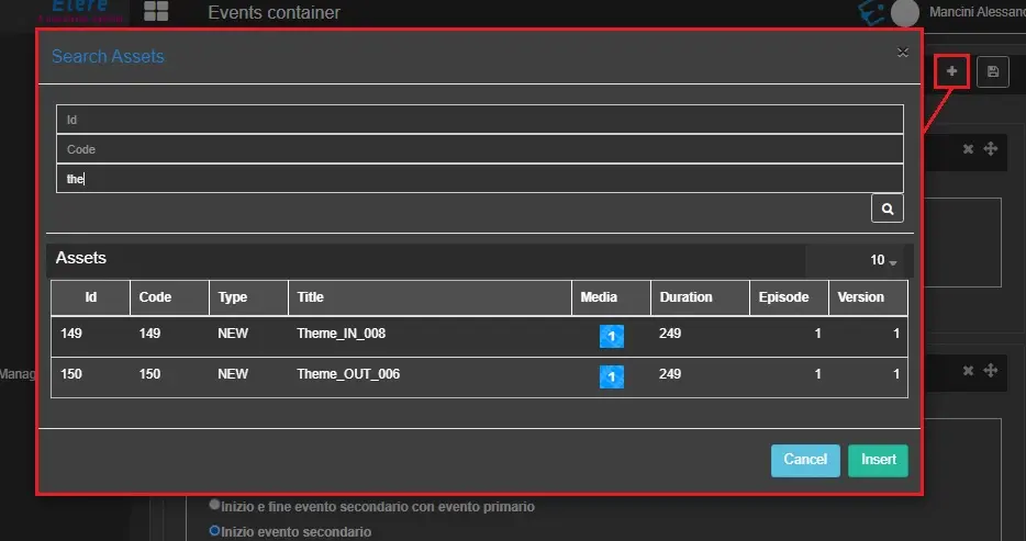 The container is now created and ready to be filled with events. Click the Add asset button and look for assets in the db through the search form.