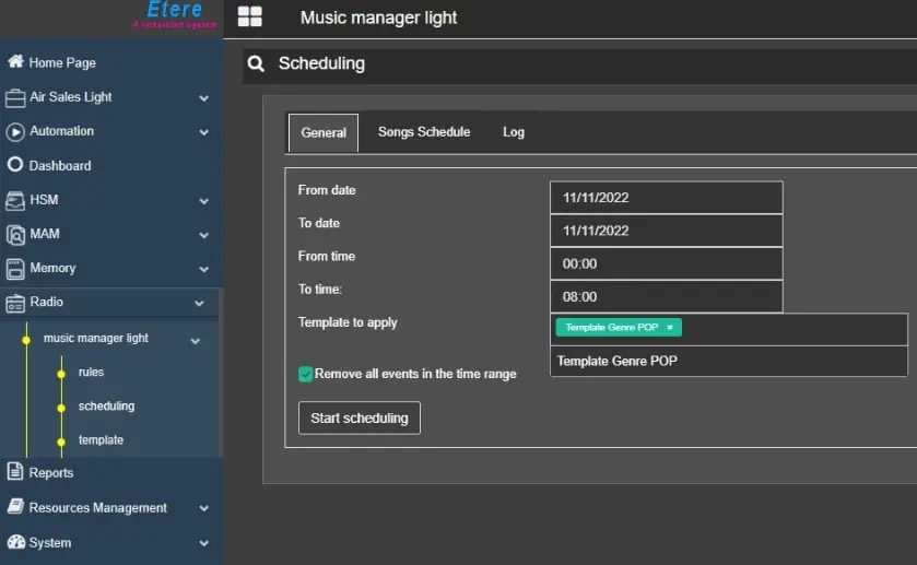 The Music Manager module allows scheduling the musical assets automatically, according to some user-defined rules and templates.