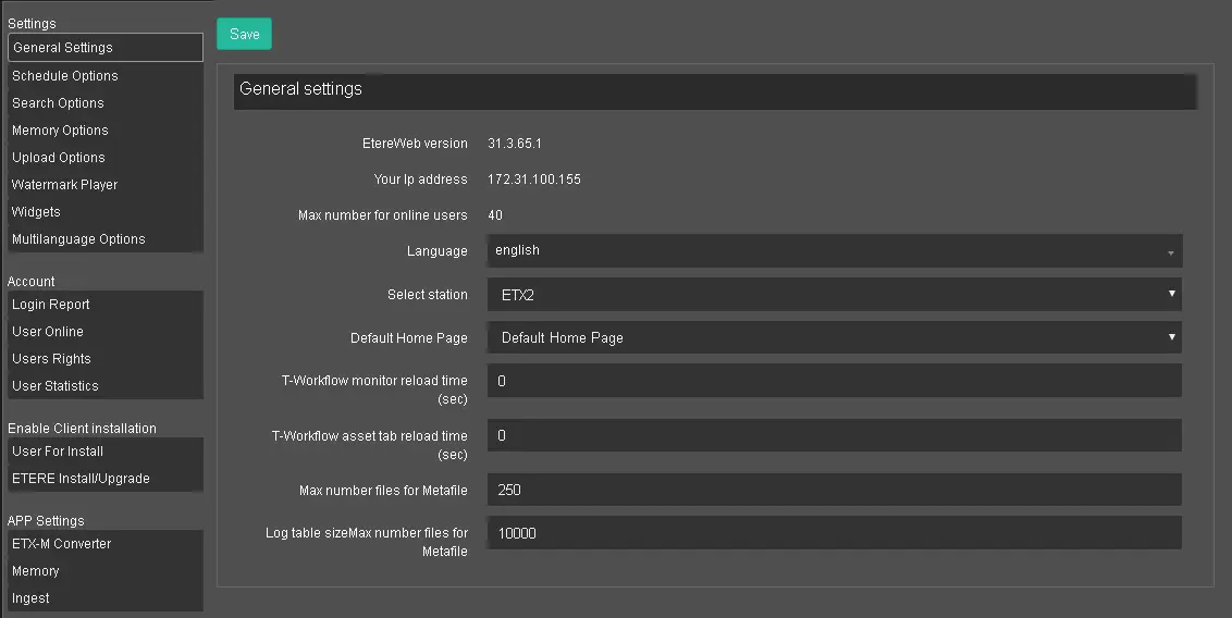 The General Settings tab displays the general information of the workstation accessing the Etere Web site.