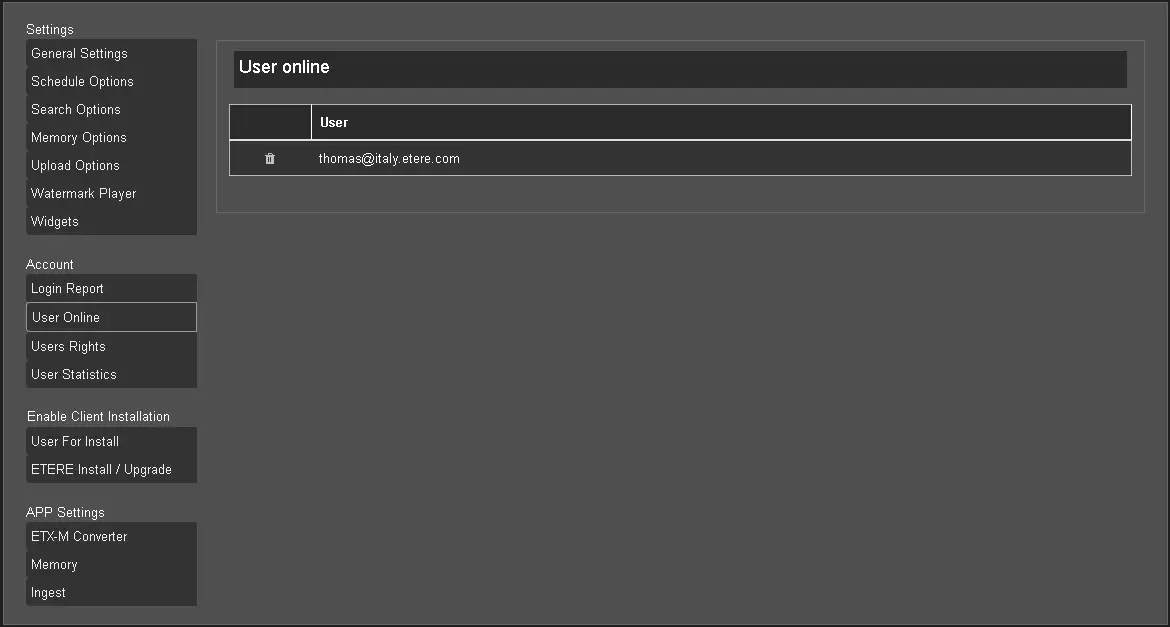 The User Online section allows to manage user connections to Etere Web and disconnects users from EtereWeb if necessary.