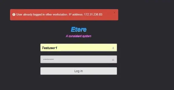 The login error would still be displayed even after restarting the Etere Web application or the Web Server. You must re-login to the same machine with the same credentials and perform a correct log-off to regain access.