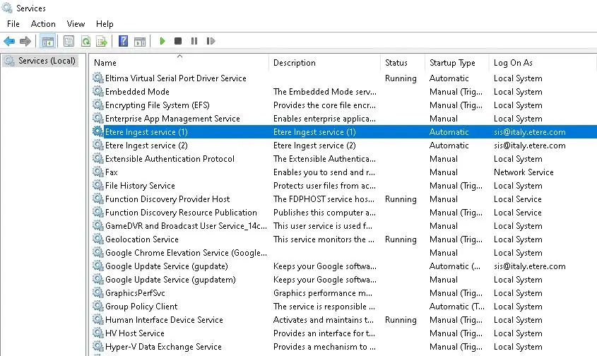 Once the installation is done, the system will create new Windows Services called "Etere Ingest Service (x)", where 'x' represents the identification number of the service, depending on how many instances we have chosen during the installation procedure.
