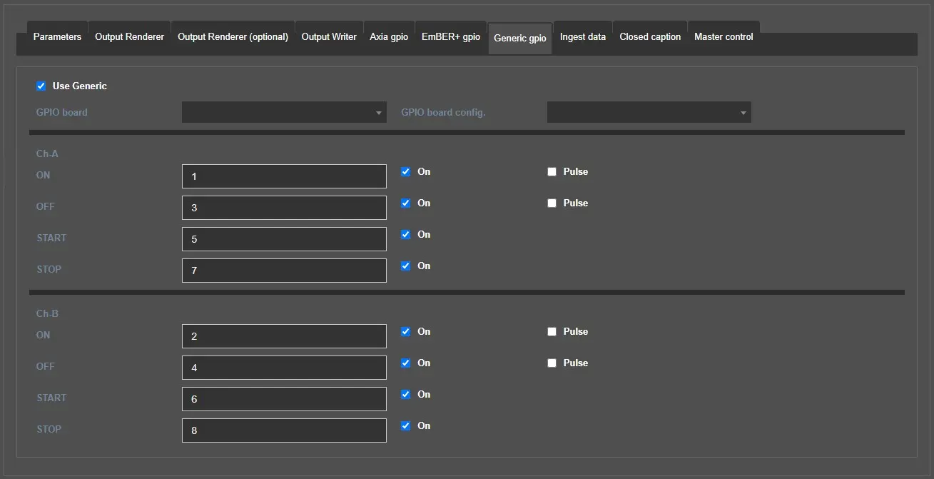 These 2 tabs allow to set the GPI numbers for each command to send and receive. They contains the same parameters but each tab refers to a different channel.