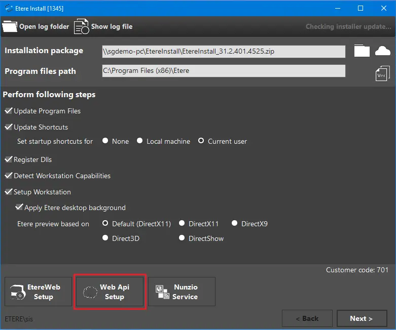 The installation of EtereWeb Service API is embedded into Etere Installer (from version 29.3 onwards) main menu to automate the Web API installation process. Similar to the Etere Web setup, the installation is an independent process.