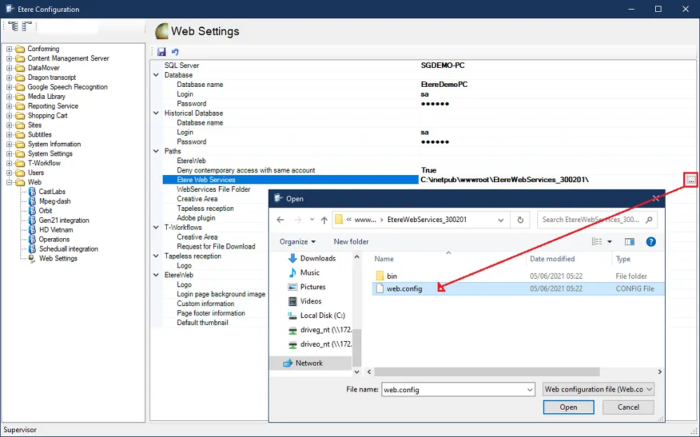 Once the Web Services API application has been installed, you must specify Etere's database parameters (database server, database name, user and password for SQL authentication).