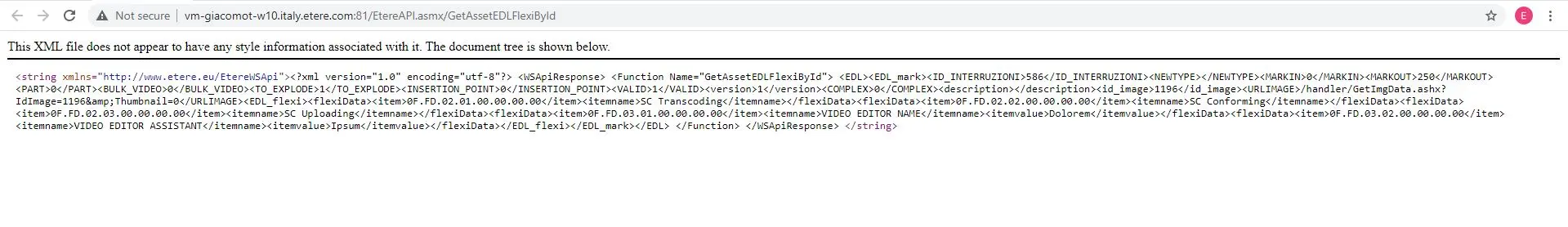 <string xmlns="http://www.etere.eu/EtereWSApi"><?xml version="1.0" encoding="utf-8"?> <WSApiResponse> <Function Name="GetAssetEDLFlexiById"> <EDL><EDL_mark><ID_INTERRUZIONI>586</ID_INTERRUZIONI><NEWTYPE></NEWTYPE><MARKIN>0</MARKIN><MARKOUT>250</MARKOUT><PART>0</PART><BULK_VIDEO>0</BULK_VIDEO><TO_EXPLODE>1</TO_EXPLODE><INSERTION_POINT>0</INSERTION_POINT><VALID>1</VALID><version>1</version><COMPLEX>0</COMPLEX><description></description><id_image>1196</id_image><URLIMAGE>/handler/GetImgData.ashx?IdImage=1196&Thumbnail=0</URLIMAGE><EDL_flexi><flexiData><item>0F.FD.02.01.00.00.00.00</item><itemname>SC Transcoding</itemname></flexiData><flexiData><item>0F.FD.02.02.00.00.00.00</item><itemname>SC Conforming</itemname></flexiData><flexiData><item>0F.FD.02.03.00.00.00.00</item><itemname>SC Uploading</itemname></flexiData><flexiData><item>0F.FD.03.01.00.00.00.00</item><itemname>VIDEO EDITOR NAME</itemname><itemvalue>Dolorem</itemvalue></flexiData><flexiData><item>0F.FD.03.02.00.00.00.00</item><itemname>VIDEO EDITOR ASSISTANT</itemname><itemvalue>Ipsum</itemvalue></flexiData></EDL_flexi></EDL_mark></EDL> </Function> </WSApiResponse> </string>