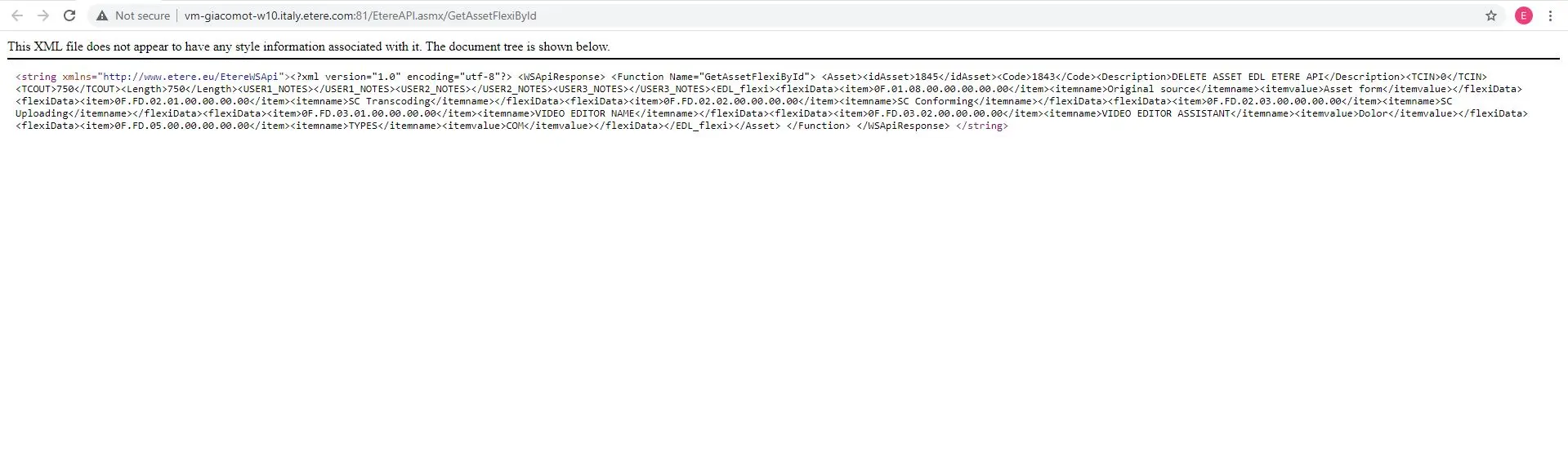 <string xmlns="http://www.etere.eu/EtereWSApi"><?xml version="1.0" encoding="utf-8"?> <WSApiResponse> <Function Name="GetAssetFlexiById"> <Asset><idAsset>1845</idAsset><Code>1843</Code><Description>DELETE ASSET EDL ETERE API</Description><TCIN>0</TCIN><TCOUT>750</TCOUT><Length>750</Length><USER1_NOTES></USER1_NOTES><USER2_NOTES></USER2_NOTES><USER3_NOTES></USER3_NOTES><EDL_flexi><flexiData><item>0F.01.08.00.00.00.00.00</item><itemname>Original source</itemname><itemvalue>Asset form</itemvalue></flexiData><flexiData><item>0F.FD.02.01.00.00.00.00</item><itemname>SC Transcoding</itemname></flexiData><flexiData><item>0F.FD.02.02.00.00.00.00</item><itemname>SC Conforming</itemname></flexiData><flexiData><item>0F.FD.02.03.00.00.00.00</item><itemname>SC Uploading</itemname></flexiData><flexiData><item>0F.FD.03.01.00.00.00.00</item><itemname>VIDEO EDITOR NAME</itemname></flexiData><flexiData><item>0F.FD.03.02.00.00.00.00</item><itemname>VIDEO EDITOR ASSISTANT</itemname><itemvalue>Dolor</itemvalue></flexiData><flexiData><item>0F.FD.05.00.00.00.00.00</item><itemname>TYPES</itemname><itemvalue>COM</itemvalue></flexiData></EDL_flexi></Asset> </Function> </WSApiResponse> </string>