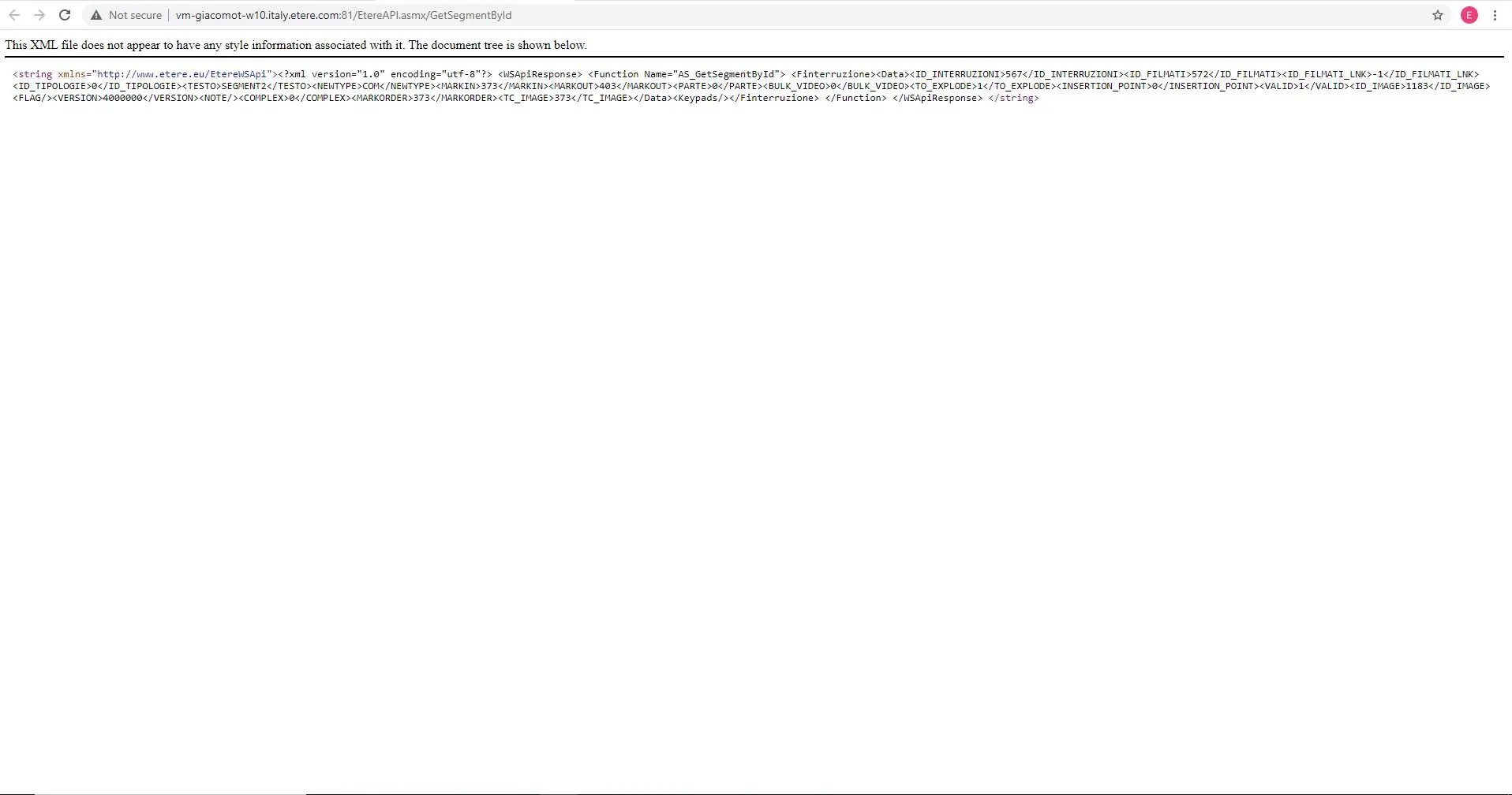 OUTPUT - <string xmlns="http://www.etere.eu/EtereWSApi"><?xml version="1.0" encoding="utf-8"?> <WSApiResponse> <Function Name="AS_GetSegmentById"> <Finterruzione><Data><ID_INTERRUZIONI>567</ID_INTERRUZIONI><ID_FILMATI>572</ID_FILMATI><ID_FILMATI_LNK>-1</ID_FILMATI_LNK><ID_TIPOLOGIE>0</ID_TIPOLOGIE><TESTO>SEGMENT2</TESTO><NEWTYPE>COM</NEWTYPE><MARKIN>373</MARKIN><MARKOUT>403</MARKOUT><PARTE>0</PARTE><BULK_VIDEO>0</BULK_VIDEO><TO_EXPLODE>1</TO_EXPLODE><INSERTION_POINT>0</INSERTION_POINT><VALID>1</VALID><ID_IMAGE>1183</ID_IMAGE><FLAG/><VERSION>4000000</VERSION><NOTE/><COMPLEX>0</COMPLEX><MARKORDER>373</MARKORDER><TC_IMAGE>373</TC_IMAGE></Data><Keypads/></Finterruzione> </Function> </WSApiResponse> </string>