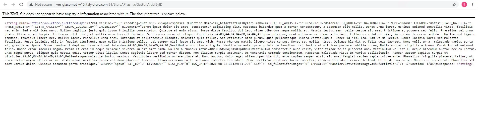 <string xmlns="http://www.etere.eu/EtereWSApi"><?xml version="1.0" encoding="utf-8"?> <WSApiResponse> <Function Name="AR_GetArtistFullById"> <dbo.ARTISTI ID_ARTISTI="1" DESCRIZIO="dolorem" ID_RUOLI="2" NAZIONALITA="" NOME="Naomi" COGNOME="Watts" STATO_NASCITA="" PAESE_NASCITA="" CITTA_NASCITA="" SEGNO_ZODIACALE="" INDIRIZZO="" BIOGRAFIA="Lorem ipsum dolor sit amet, consectetur adipiscing elit. Maecenas bibendum quam a tortor consectetur, a accumsan elit mollis. Donec urna lorem, maximus euismod convallis vitae, facilisis nec enim. Sed a ultrices nunc. Nullam sagittis justo quis ipsum fringilla consectetur. Quisque et enim risus. Suspendisse faucibus dui leo, vitae bibendum neque mollis eu. Mauris lectus sem, pellentesque sit amet tristique a, posuere sed felis. Phasellus vel urna justo. Etiam ac mi turpis. In tempor elit nisl, et mattis urna laoreet lacinia. Sed tempus purus et aliquet facilisis.