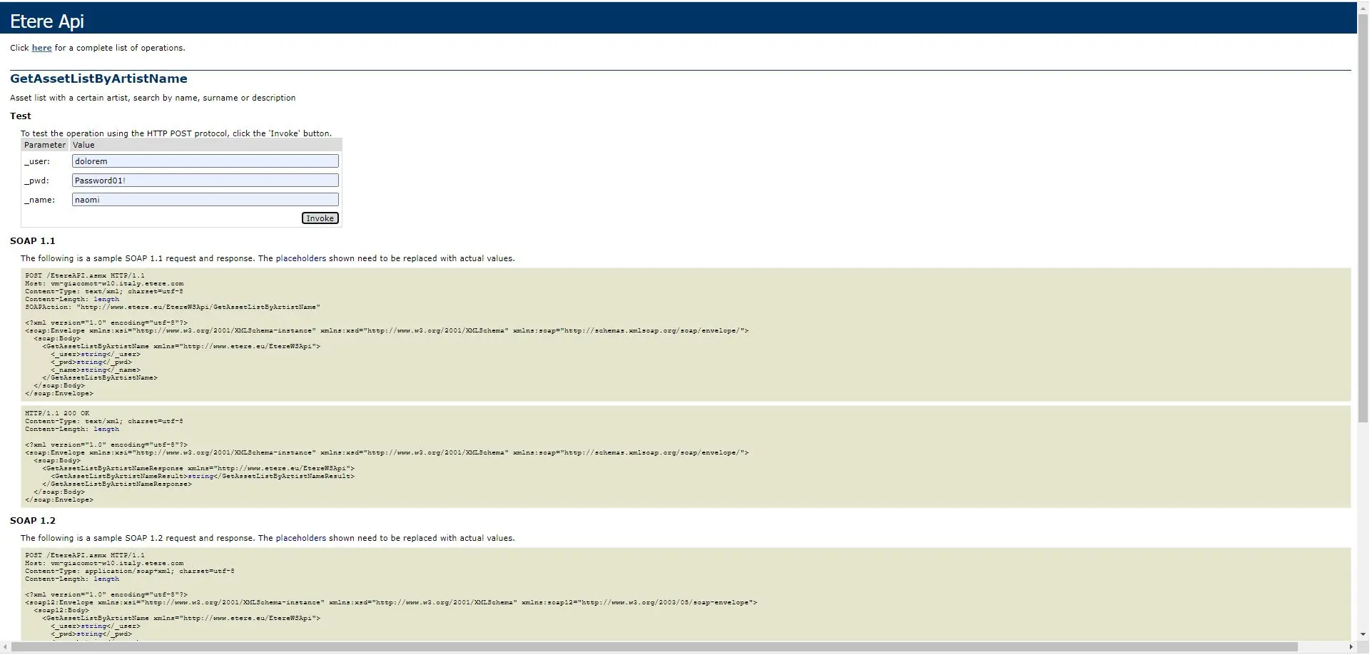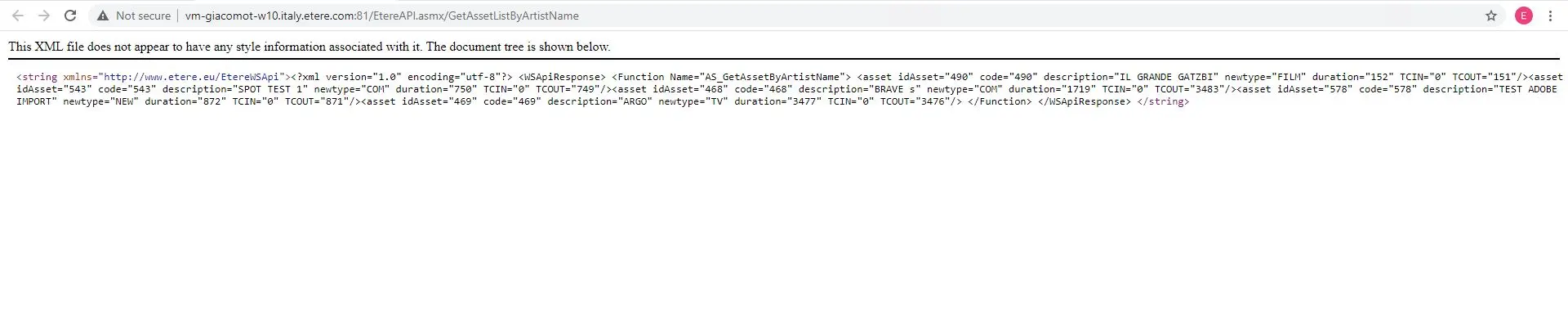 <string xmlns="http://www.etere.eu/EtereWSApi"><?xml version="1.0" encoding="utf-8"?> <WSApiResponse> <Function Name="AS_GetAssetByArtistName"> <asset idAsset="490" code="490" description="IL GRANDE GATZBI" newtype="FILM" duration="152" TCIN="0" TCOUT="151"/><asset idAsset="543" code="543" description="SPOT TEST 1" newtype="COM" duration="750" TCIN="0" TCOUT="749"/><asset idAsset="468" code="468" description="BRAVE s" newtype="COM" duration="1719" TCIN="0" TCOUT="3483"/><asset idAsset="578" code="578" description="TEST ADOBE IMPORT" newtype="NEW" duration="872" TCIN="0" TCOUT="871"/><asset idAsset="469" code="469" description="ARGO" newtype="TV" duration="3477" TCIN="0" TCOUT="3476"/> </Function> </WSApiResponse> </string>