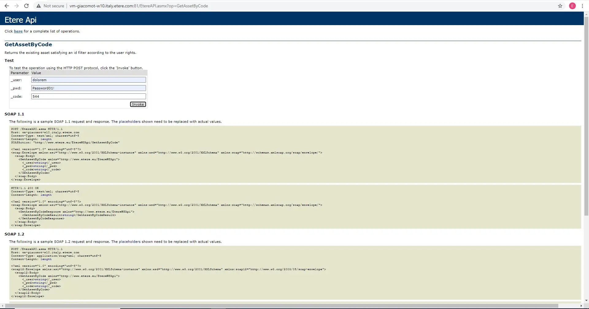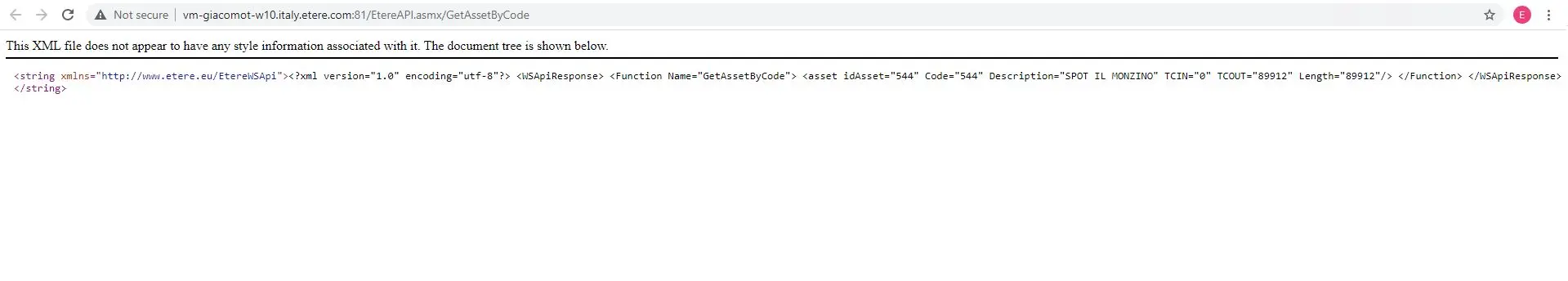 <string xmlns="http://www.etere.eu/EtereWSApi"><?xml version="1.0" encoding="utf-8"?> <WSApiResponse> <Function Name="GetAssetByCode"> <asset idAsset="544" Code="544" Description="SPOT IL MONZINO" TCIN="0" TCOUT="89912" Length="89912"/> </Function> </WSApiResponse> </string>