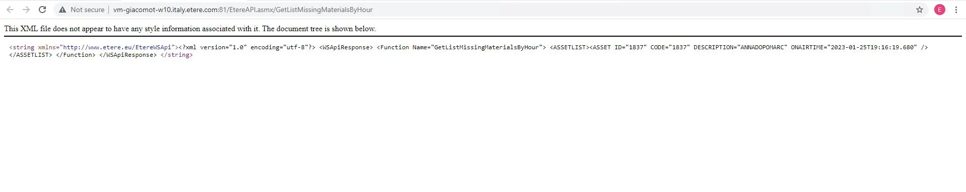 <string xmlns="http://www.etere.eu/EtereWSApi"><?xml version="1.0" encoding="utf-8"?> <WSApiResponse> <Function Name="GetListMissingMaterialsByHour"> <ASSETLIST><ASSET ID="1837" CODE="1837" DESCRIPTION="ANNADOPOMARC" ONAIRTIME="2023-01-25T19:16:19.680" /></ASSETLIST> </Function> </WSApiResponse> </string>