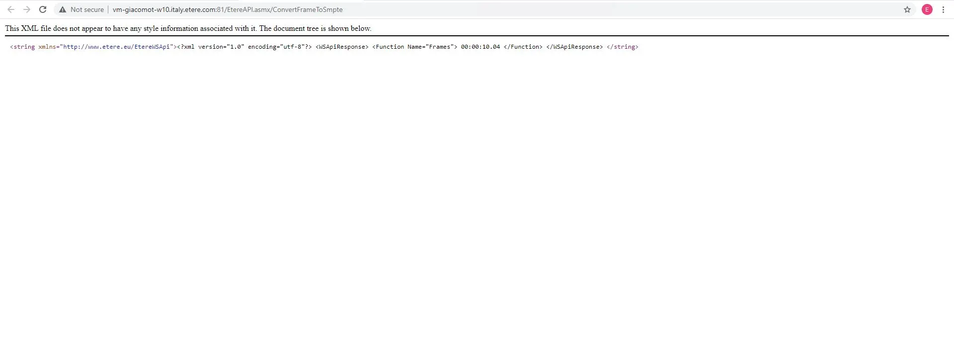 <string xmlns="http://www.etere.eu/EtereWSApi"><?xml version="1.0" encoding="utf-8"?> <WSApiResponse> <Function Name="Frames"> 00:00:10.04 </Function> </WSApiResponse> </string>