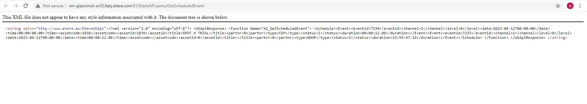<string xmlns="http://www.etere.eu/EtereWSApi"><?xml version="1.0" encoding="utf-8"?> <WSApiResponse> <Function Name="AS_GetScheduledEvent"> <Schedule><Event><eventid>7234</eventid><channel>1</channel><level>0</level><date>2023-06-12T00:00:00</date><time>00:00:00.00</time><assetcode>1836</assetcode><assetid>1836</assetid><title>SPOT X TRIAL</title><partnr>0</partnr><type>COM</type><status>I</status><duration>00:00:12.06</duration></Event><Event><eventid>7233</eventid><channel>1</channel><level>0</level><date>2023-06-12T00:00:00</date><time>00:00:12.06</time><assetcode></assetcode><assetid>0</assetid><title></title><partnr>0</partnr><type>NOOP</type><status>I</status><duration>23:59:47.19</duration></Event></Schedule> </Function> </WSApiResponse> </string>