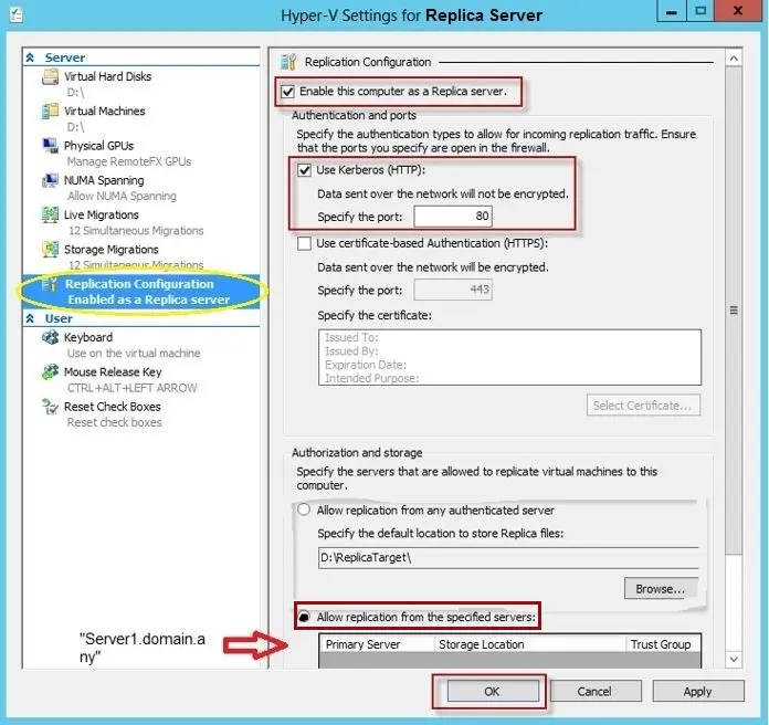 • Enable the option "Allow replication from the specified servers:" and add the Primary Server name, including the Domain name and Trust Group.