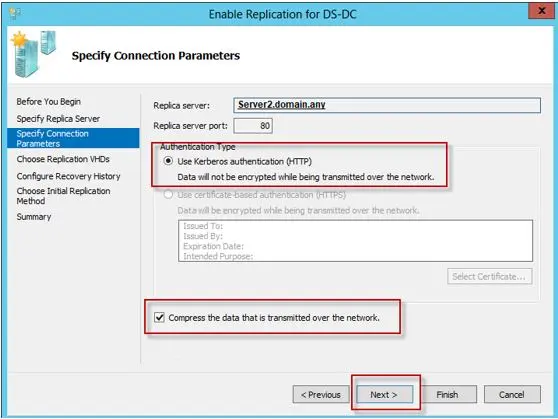 6. The Replica Server name and port number have been specified, along with the "Use Kerberos authentication (HTTP)" option enabled; make sure that the "Compress the data that is transmitted over the network" option is turned on.