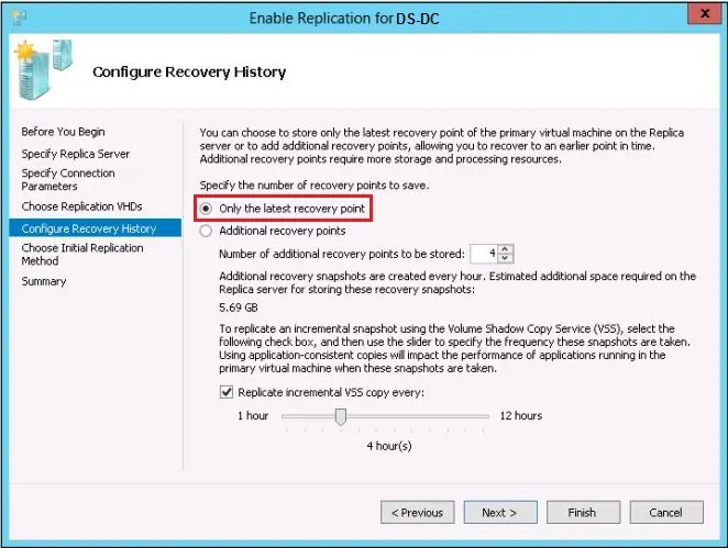 8. select the "Only the latest recovery point" option in the Configure Recovery History. It is recommended that the recovery point be archived with 30 seconds of frequency.