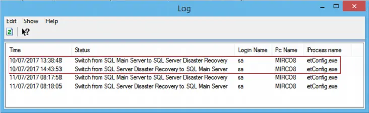 The database switching process would be recorded in the SQL Log for the attention of the System Administrator.