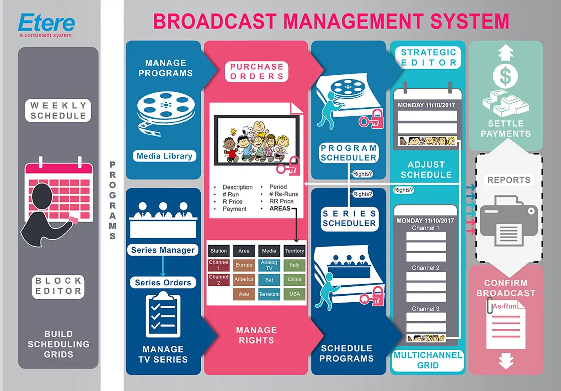 The figures above illustrate Etere BMS's roles in the Broadcasting Rights Management process, covering key elements such as programming structure, programs management, season management, rights management, delivery orders, scheduling, etc.