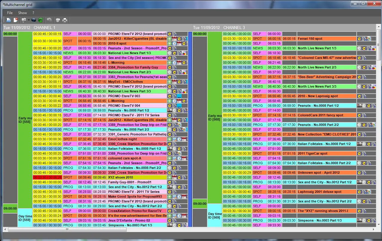 The Multichannel Grid module came with a robust, intuitive and easy-to-use interface, permits operators to view and modify the scheduling playlists of one or more stations. The main interface has been divided into the following areas: