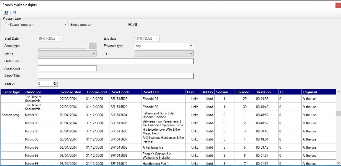 Description : Search for all the programs/seasons loaded into the Purchase Orders module which are valid for the current day (i.e. with broadcast rights). The search engine allows filtering results by: