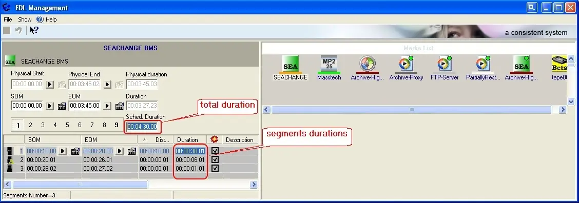 This function allows to modify the duration of the segments belongs to the selected event (which must have been exploded) by handling its EDL Management form: