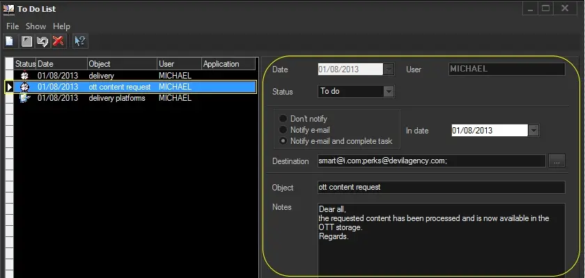 Please note that in order to use this feature, some connection parameters must be set under the "Etere Configuration > Settings >ToDo Notifications" section.