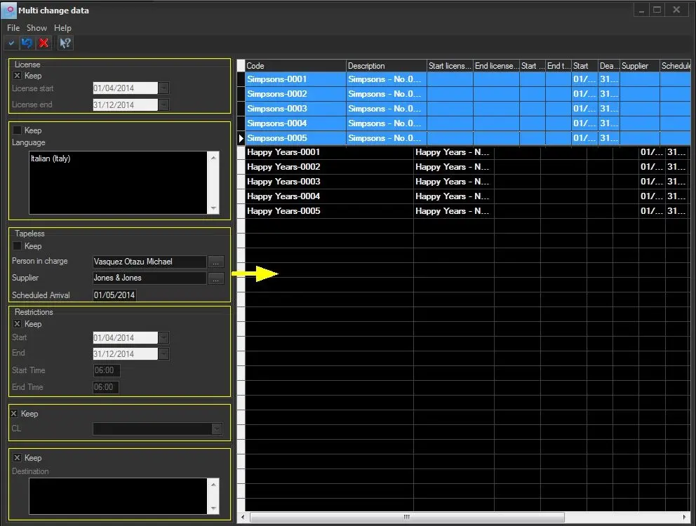 The "Multichange data" functions provides a useful interface to quickly modify one or more properties across multiple order lines. Data supported for multi-change includes license dates, language, tapeless, classification and restrictions.