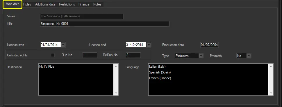 The "Main" tab allows entering the overall information on the content (i.e. single/season program) to be delivered through the current order line, this information includes the following relevant data: