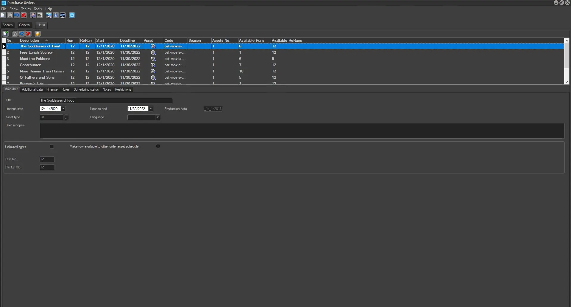 Under the 'Lines' tab you are required to input the breakdown of the purchase order with details of every line in the purchase order relates to the licensing rights of a particular single/season program.