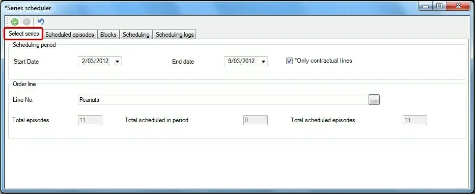 In case the station has an Etere BMS license (i.e. seasons are loaded into the Purchase Orders to manage their broadcast rights), the Season Scheduler will allow to search (and select) the order line related to the season to be scheduled taking into account their broadcasting rights: