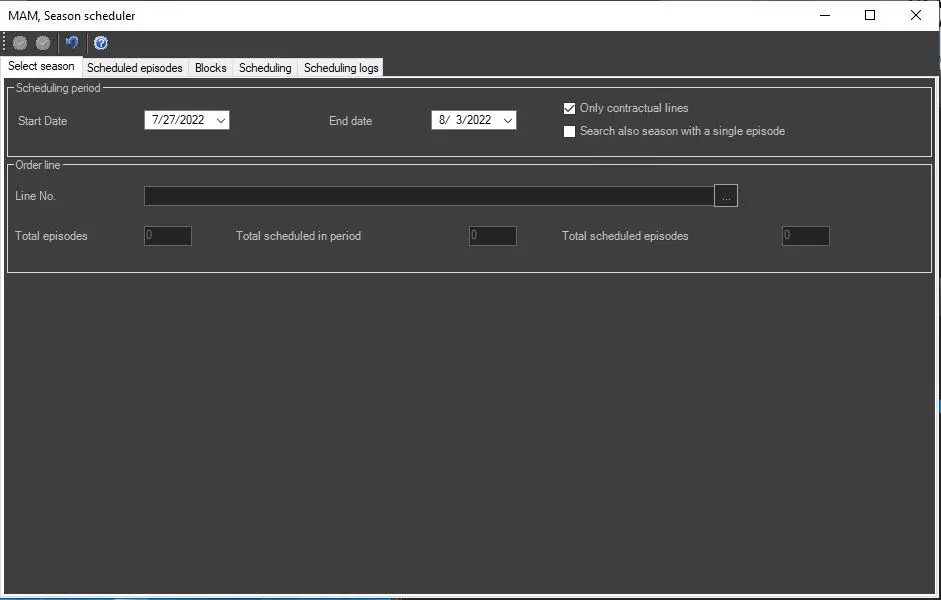 If the station doesn't have an Etere BMS license, the Season Scheduler will allow to search and select the season to be scheduled: