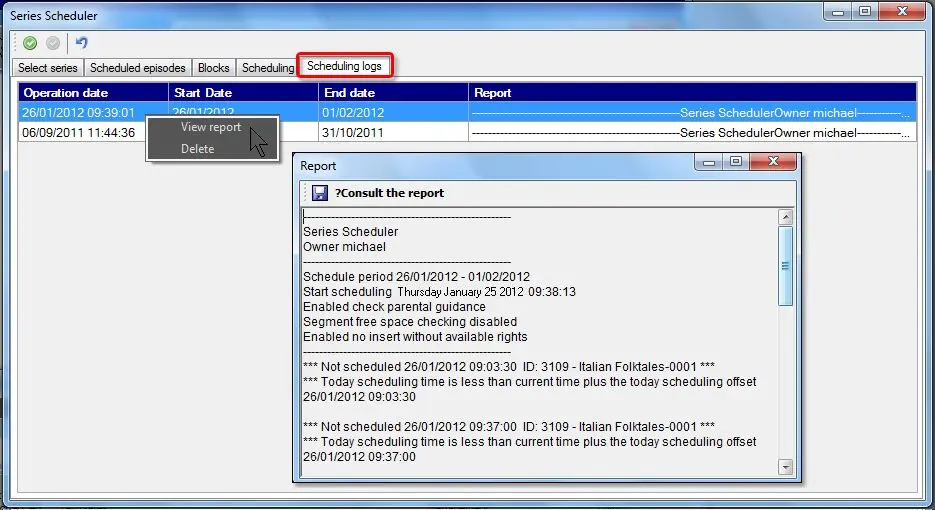 •View report: Show a detailed log of all the operations (e.g. insertions, warnings, errors) related to the selected scheduling.