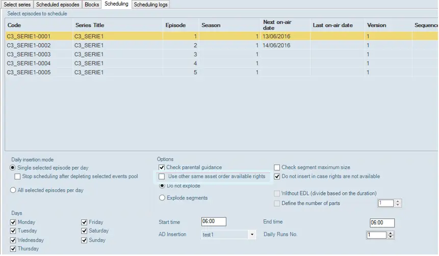 •Do not insert in case rights are not available: If enabled, If the season is subjected to a purchase order, it will be scheduled taking into account the number of rights (Runs and ReRuns) available for scheduled.