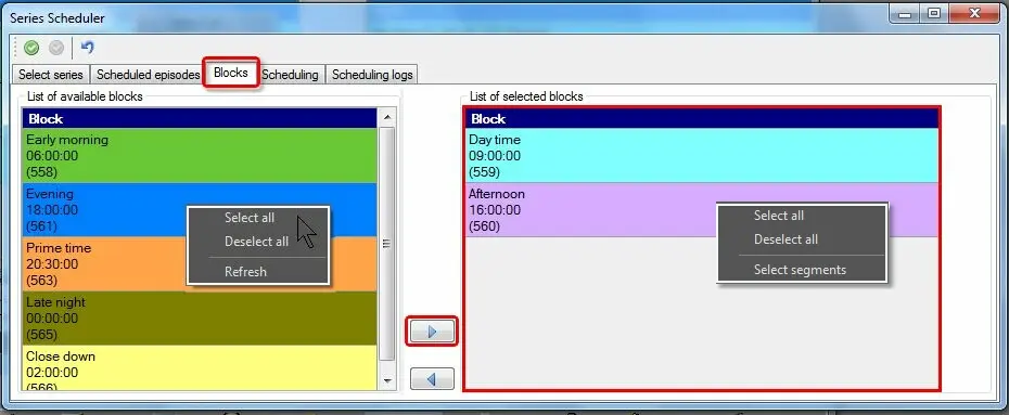 The Blocks section allows to specify the target blocks on which season episodes will be scheduled. This section is mainly formed by two panel, the left panel list all available blocks (i.e. present on the period's schedule structure and valid for the season' asset type. ), and the right panel list all the blocks added by the operator to hold scheduled episodes. Both panels can be managed through the following functions: