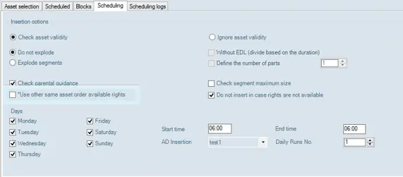 •Do not insert in case rights are not available: In case the asset is subjected to a purchase order which doesn't has rights for scheduling more Runs/ReRuns, the asset won't be scheduled.