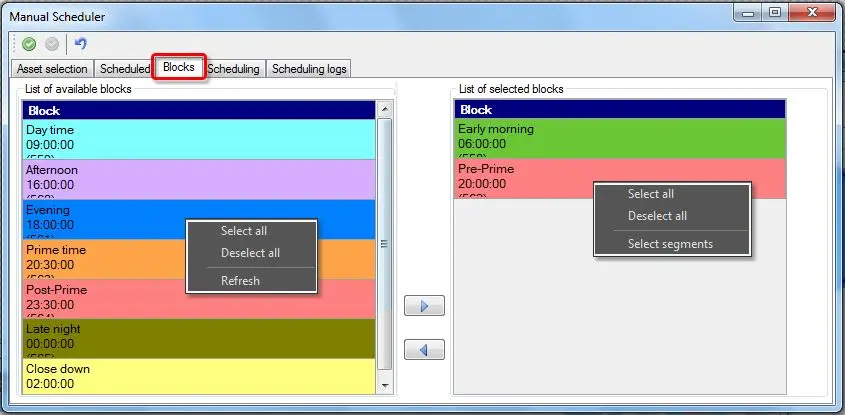 The Blocks section allows to specify the target blocks on which the asset will be scheduled. This section is mainly divided by two panel, the left panel displays all available blocks (i.e. present on the period's schedule structure and valid for the asset's type), and the right panel display all the blocks added by the operator to hold scheduled asset runs. Both lists can be managed through the following functions:
