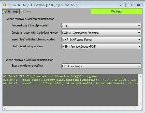 Once the [EVS_main_icon01 Start] button is pressed, the web service starts listening for notifications; every time a notification is received from the EVS IP Director, the EVS Integration Tools application performs one of the following procedures depending on the notification type and the main settings: